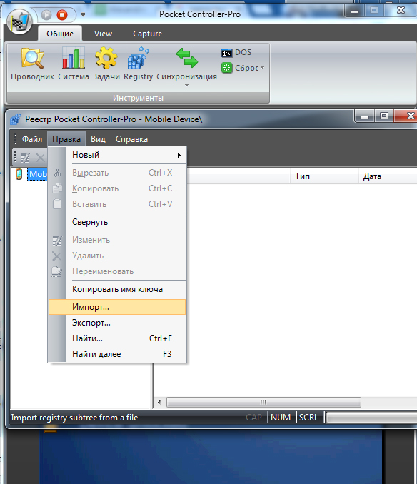 14. На ПК в Pocket Controller-Pro заходим в [Registry -> Правка -> Импорт] и выбираем файлик 122.reg из папки [\\192.168.0.226\Transit\!4\Обновление DS5]