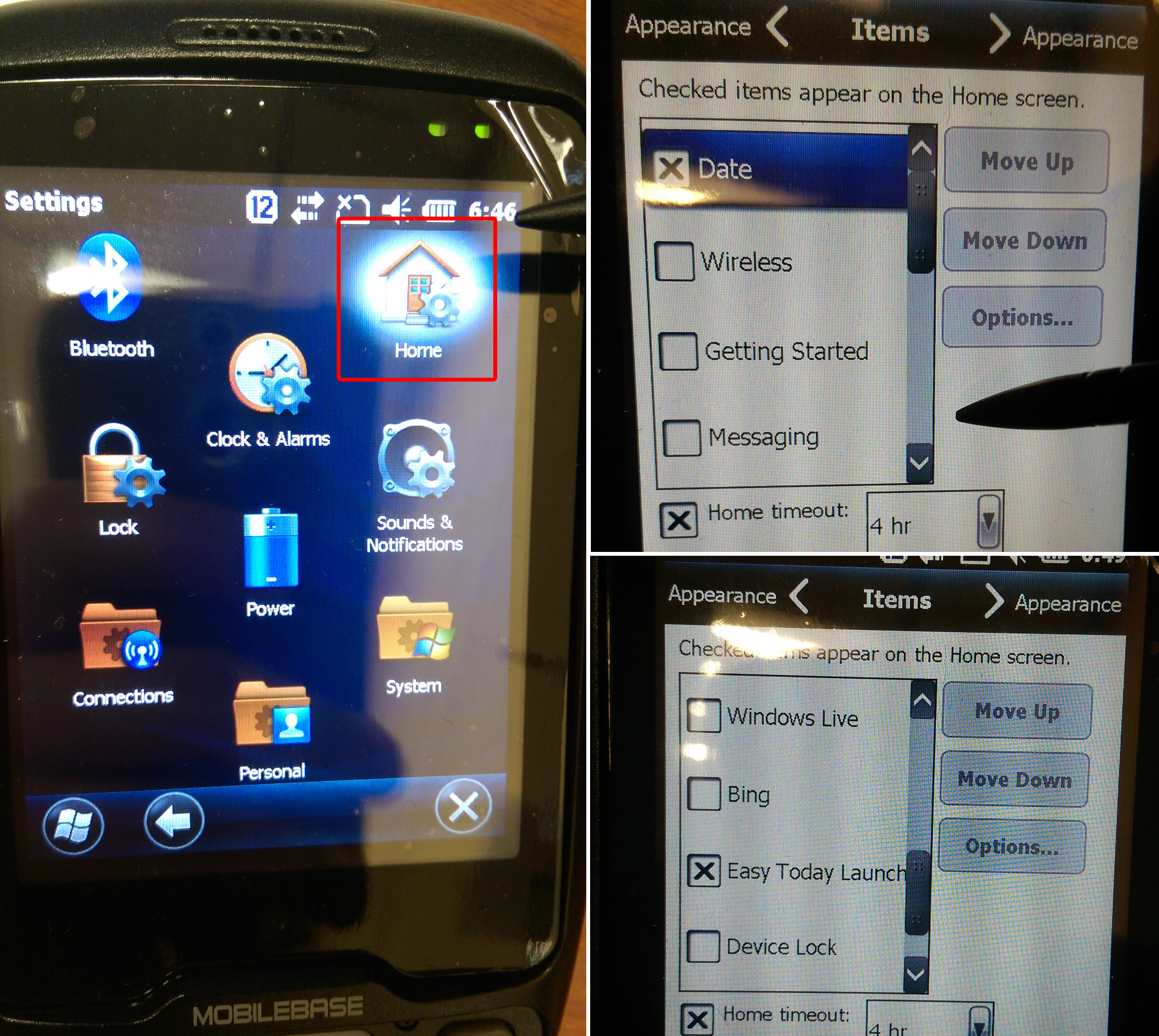 20. На ТСД заходим в меню ПУСК -> Settings -> Home вкладка Items оставляем активными пункты Date и Easy Today Launch