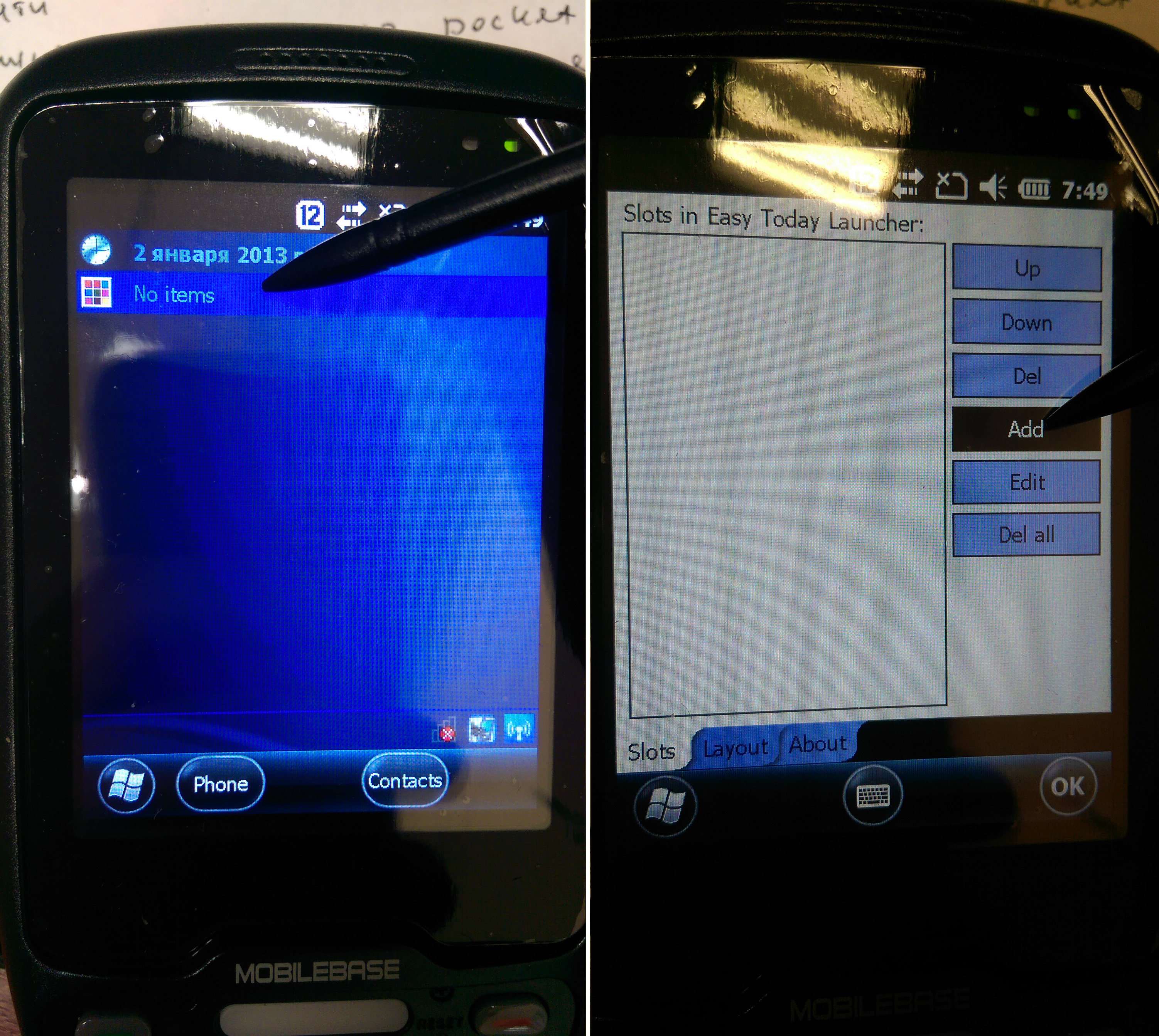 27. На экране ТСД нажимаем на надпись No items и попадаем в меню добавления значков на рабочий стол. Жмем Add, после ... в выпадающем списке выбираем флеш накопитель Nand папку temp -> Programs и по очереди добавляем на рабочий стол 4 ярлыка.
