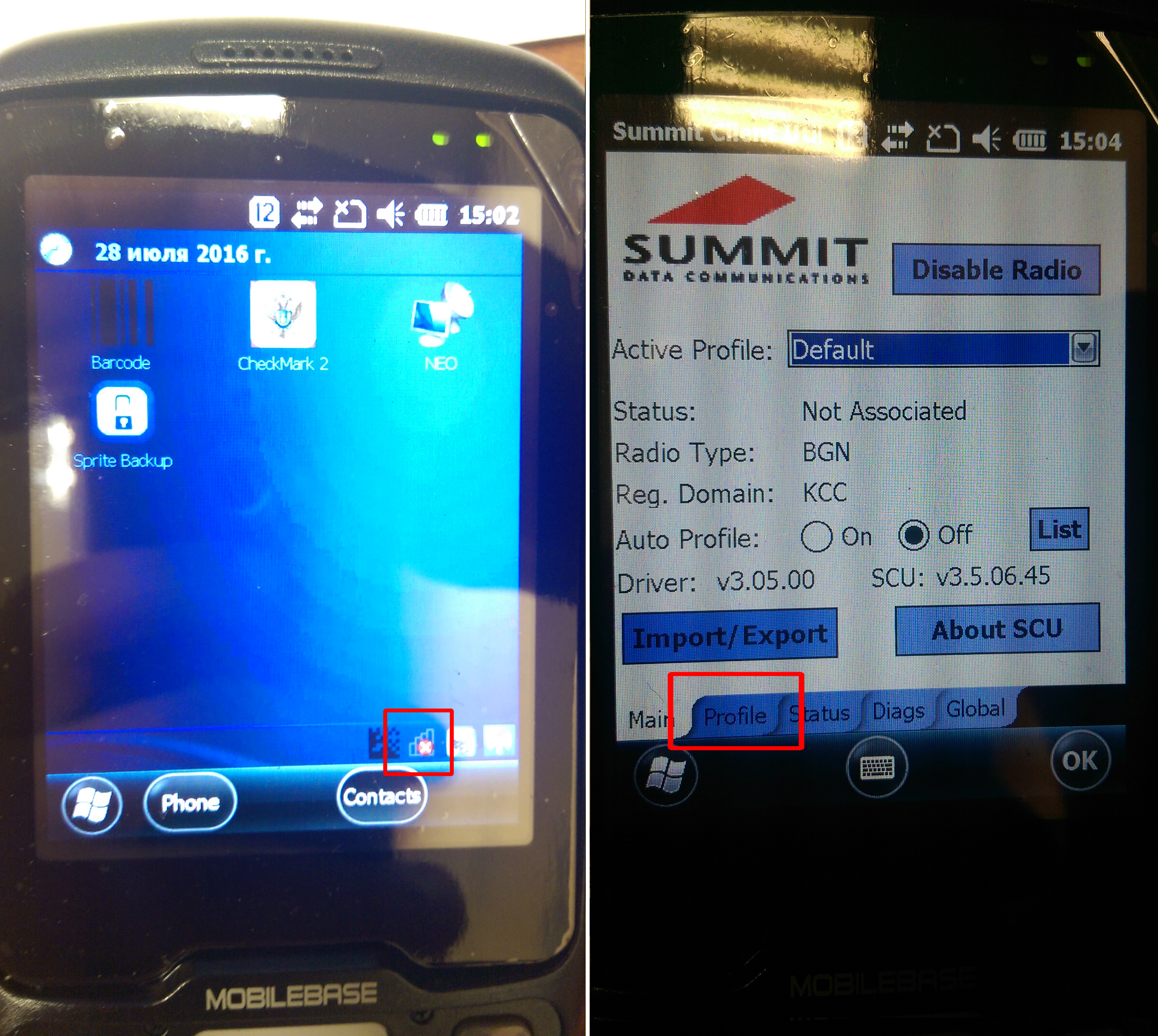 28. На экране ТСД нажимаем иконку сети, и попадаем в меню настройки WIFI соединения. Заходим во вкладку Profile