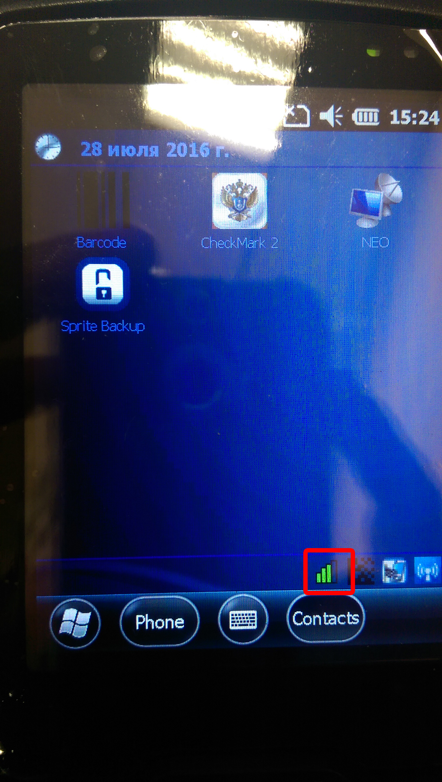 15. На рабочем столе ТСД нажимаем на синюю иконку [ 1 ] и смотрим что бы пункты [ PHONE ] и [ WIFI ] горели зеленым цветом.