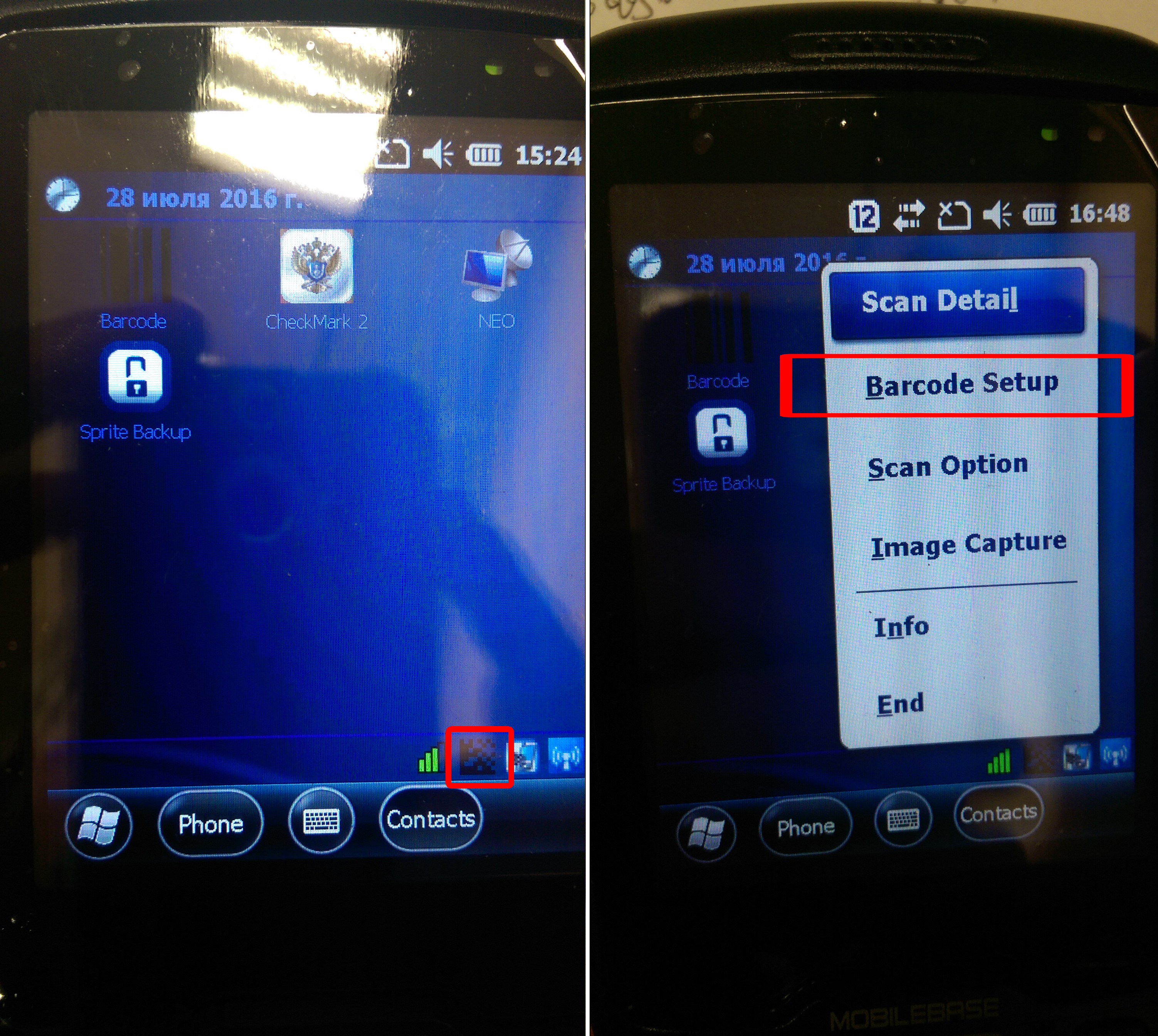 16. На ТСД заходим в меню ПУСК -> MobileBaseCheck и данные IMEI и SERIAL записываем на сайт www2.neo63.ru на страницу магазина Пеликан для которого настраиваем данный терминал